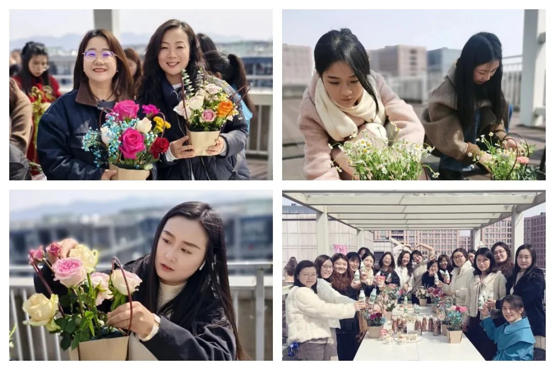 3月8日,在杭州管理总部顶楼,一场热闹的插花主题活动在灿烂的春光中精彩上演。一到活动现场,女性员工们便感受到扑鼻而来的花香,一簇簇鲜花种类不一,色彩多样,吐露着春天的芬芳。配合着头顶上游荡春风中的蓝天白云,描绘出一幅无限美好的画卷。