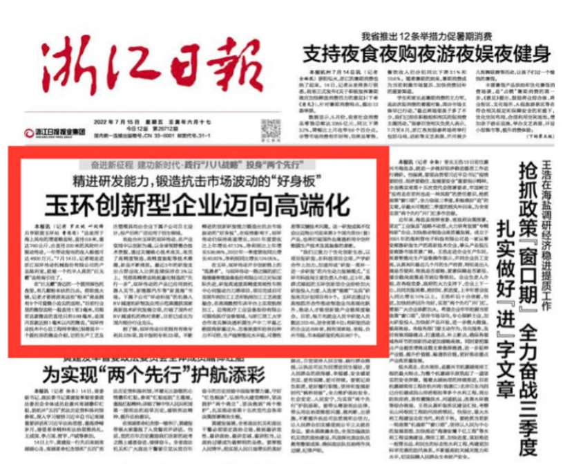 7月15日,《浙江日报》头版头条刊发了题为《精进研发能力,锻造抗击市场波动的“好身板” ,玉环创新型企业迈向高端化》文章,用大篇幅报道了双环传动在研发创新领域的生动详实的案例。