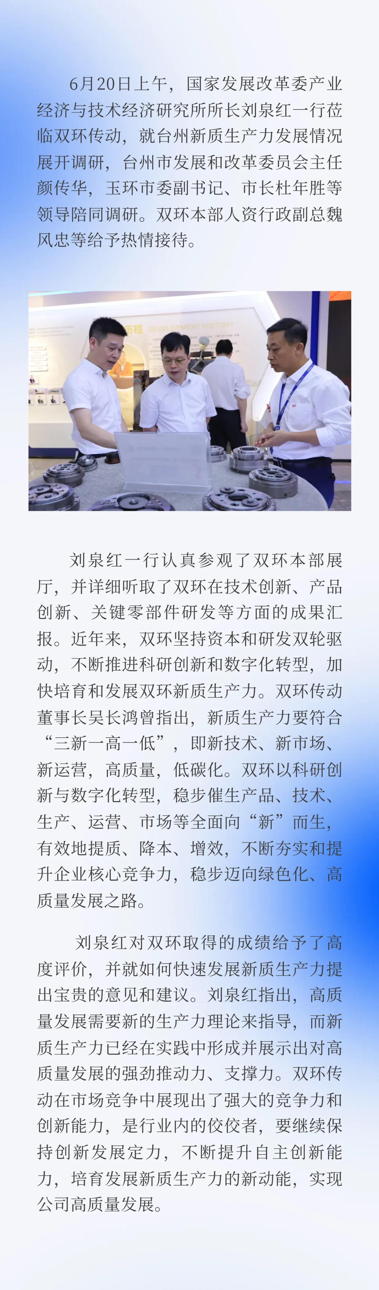 国家发改委产业经济与技术经济研究所所长刘泉红一行莅临双环传动调研指导