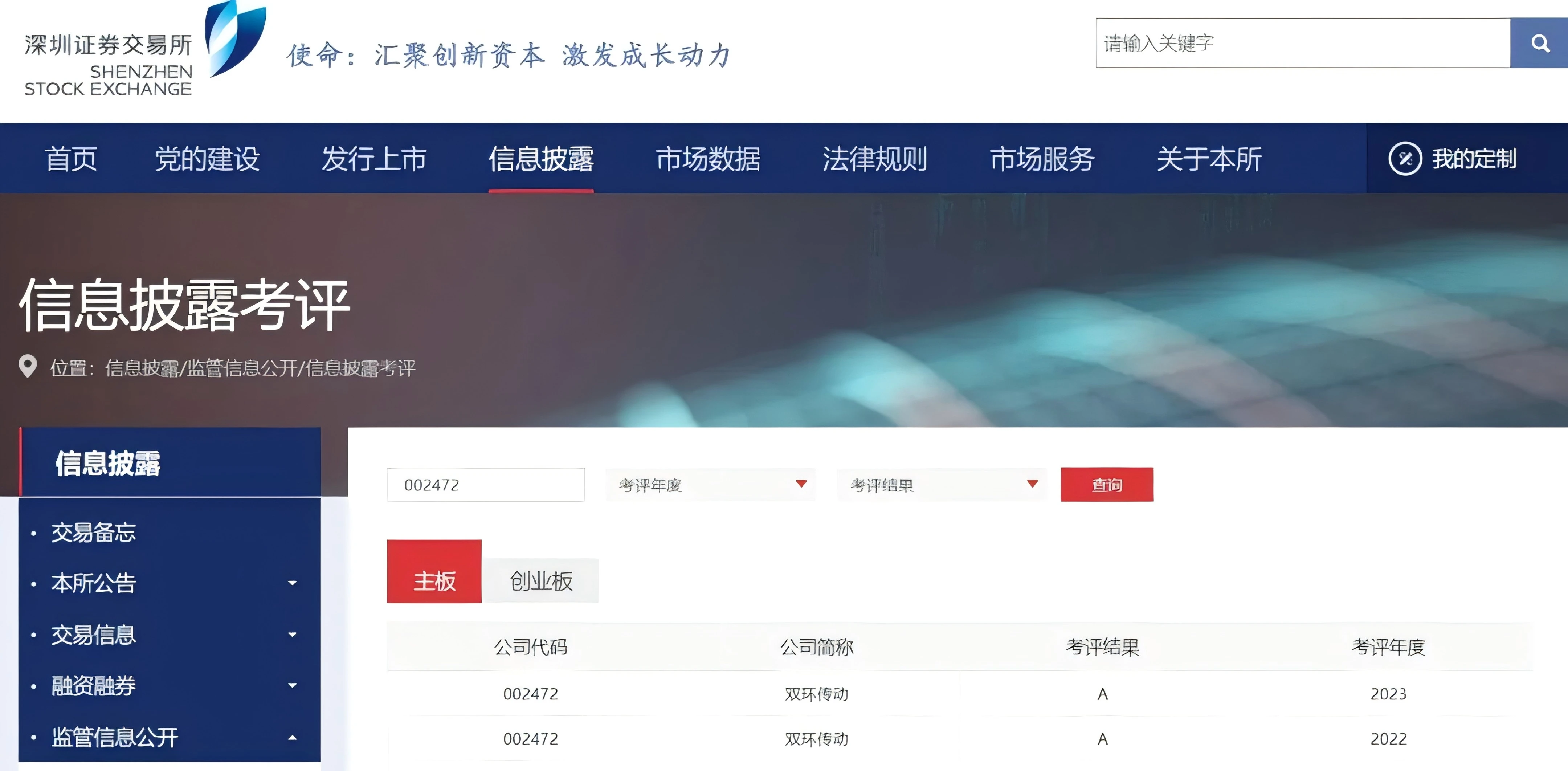 近日,深圳证券交易所发布了《关于深市上市公司2023-2024年度信息披露工作评价结果的通报》,双环传动(股票代码:002472)以持续规范的公司治理、高质量的信息披露、良好的投资者关系维护等优异表现,再度获得最高评价等级“A”级。