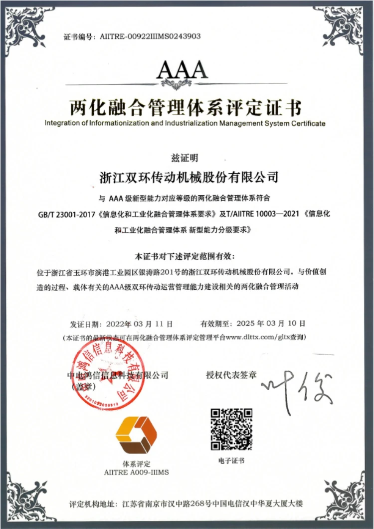 随着制造行业数字化改革突飞猛进,双环传动在坚持“好一点,好很多”价值观的过程中,紧随行业浪潮,以“两化融合”评定为契机,努力打造两化融合贯标标杆,不断发挥两化融合在智能制造、绿色工厂、双碳经济、大数据建设中的作用,培育发展新动能,助力公司数字化转型,提升核心竞争力,在全球开辟更加广阔的发展空间。