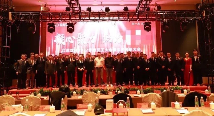 双环传动总经理MIN ZHANG,双环传动副总经理、江苏双环董事长蒋亦卿,江苏双环总经理卢浩,副总经理汪土华、赵俊杰、陈香籽,江苏双环各部门长及公司2022年度先进人物、获奖代表、10-20年工龄奖获得者和部分员工代表共200余人出席了此次会议。